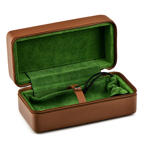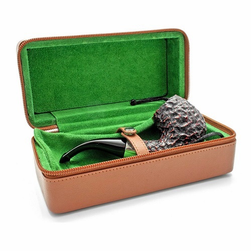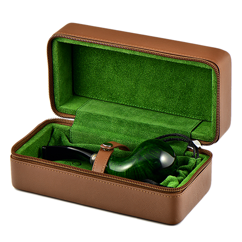 Жесткий футляр для трубки Peterson, с прочной внешней поверхностью из усиленной кожи, дополненной внутренней подкладкой из зеленой замши и с кожаной застежкой в тон.
