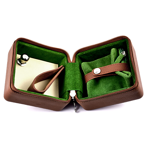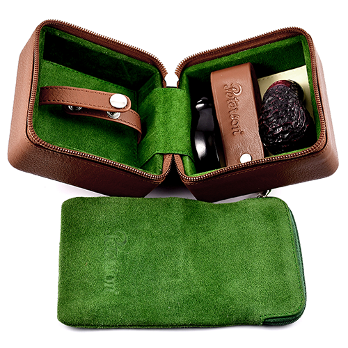 Дорожный кейс Grafton System Pipe,имеет прочный твердый внешний вид из усиленной коричневой кожи, дополненный внутренней подкладкой из зеленой замши и соответствующей коричневой кожаной застежкой. Внутри зеленый замшевый кисет для табака и коричневая кожаная подставка для трубки дополняют аксессуар «все в одном», помогая легко и элегантно закрепить трубку.