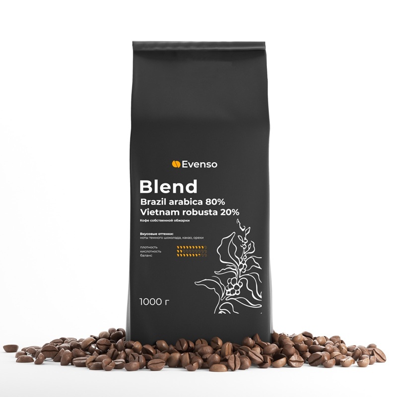 Бленд Арабики и Робусты в соотношении 80% и 20%. Плотный кофе с нотами жареных орехов, какао и темного шоколада.Кофе Бразилия Сантос - один из самых массовых сортов на кофейном рынке. Кофе плотный и гладкий, ароматный и сбалансированный, без лишней кислотности. Робуста Вьетнам - это сорт кофе, который благодаря обжарке наделён стойким приятным ароматом и традиционным горьковатым вкусом. Именно его насыщенный аромат и придаёт напитку благородства.