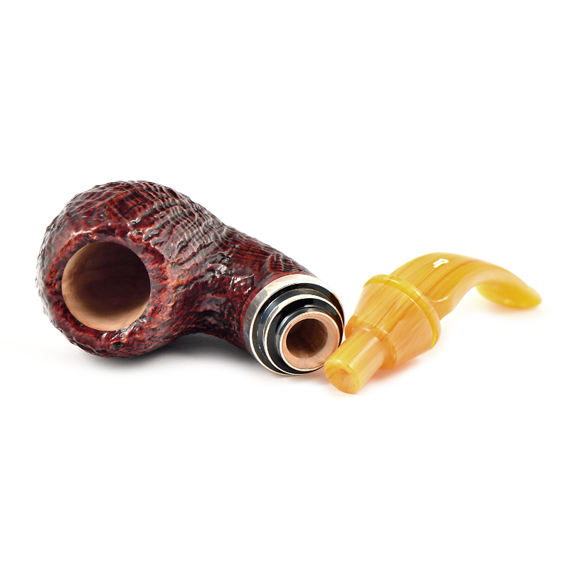 Ручная работа трубки, созданная итальянскими мастерами Rinaldo, сочетает глубокий, выразительный пескоструй с идеальными пропорциями и акцентом на материале. Бриар премиального качества, акриловый мундштук и кольцо из серебра 925 пробы формируют гармоничный, по-настоящему статусный образ.