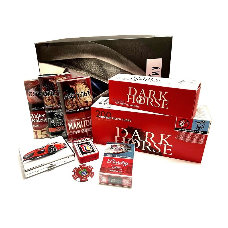 Подарочный набор для создания собственных сигарет, включающий три табачные смеси:Manitou Special Red №8 - (Cмесь Virginia табаков без добавок. Изготовлен без использования каких либо химических консервантов, синтетических ароматизаторов, увлажнителей.В незажжённом состоянии: Аромат яркий, приятный, натуральный, с естественной сладостью. )Van Erkoms Caramel (Нарезка табака мелкая и равномерная. Мусор в нарезке минимален, что говорит о высоком качестве производства. Нарезка отлично подходит как для создания самокруток, так и для набивки в сигаретные гильзы. Аромат карамели.)Walter Raleigh 1585 Cherry (отличный вариант самокруточного табака на каждый день. Аромат спелой вишни.)Одну машинку для набивки гильз Dark Horse (Польша), гильзы Dark Horse (200 шт.), замечательный портсигар на 20 сигарет, сигариллы Barclay (со вкусом вишни) и зажигалка в виде коробки спичек, а так-же наша фирменная фишка-визитка.
