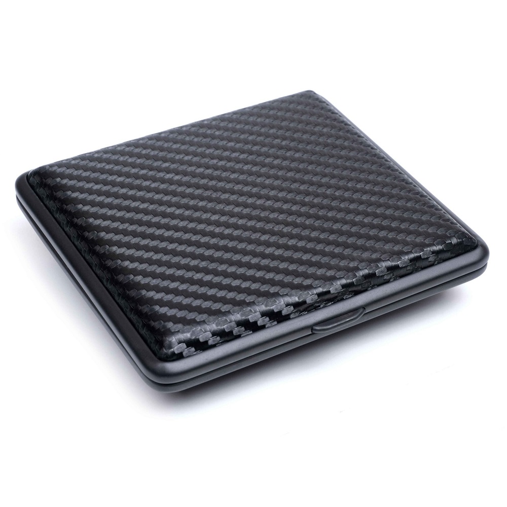 Корпус из металла с черненой рамкой и наружной отделкой из материала, точно имитирующего карбоновое волокно. Легкое открывание одним нажатием, благодаря подпружиненным петлям.