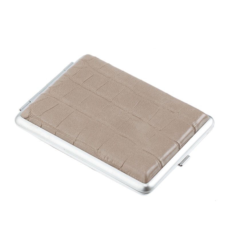 Материал: нержавеющая сталь, искуственная кожаЦвет: серо-бежевыйФактура: крокодилВнешняя отделка: сатинированная стальДержатели: резинкиРазмер: 7,4 х 9,5 х 1,8 смВместимость: 16 стандартных или 20 тонких сигарет длиной до 8,5 см