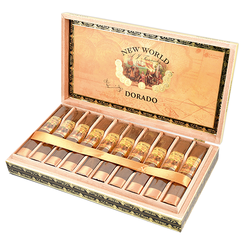 New World от A.J. Fernandez приурочены к двум знаменательным событиям: открытию Колумбом табака в 1492 году и работе A.J. над этой смесью.Новая версия сигар "New World - Dorado" отличается тёмно-золотистым цветом и полностью изготавливается из никарагуанского табака, большая часть которого поступает с фермы компании "Dorado" в Эстели.Покровный лист "Habano Sun Grown" и начинка производятся на фабрике "San Lotano" в Окотале.Начальные затяжки сливочные, с цитрусовыми нотками, далее добавляются пряные оттенки орехов и кожи.Скрутка: ручная.Формат: Gordito.Производитель: Республика Никарагуа.Покровный лист: Habano Sun Grown, Никарагуа.Связующий лист: Никарагуа.Начинка: Никарагуа.Размер: 139.7 x 23.8 мм (RG60).Индивидуальная упаковка: целлофан.Крепость: cредняя.Количество в коробке: 10 шт.