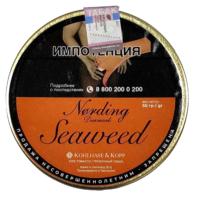 Nording SeaweedКомбинация Золотистой Вирджинии, Бёрли цвета какао и щепотки Черного Кавендиша.Приправлена нежными ароматами сливок и карамели.В результате получается табак с приятным сладким вкусом и изысканным ароматом.Крепость: 1,5-2 по 5-ти бальной шкале.Вкусовая группа: АроматикНарезка: RibbonСостав: Black Cavendish, Virginia, BurleyАроматизация: Сливки, Карамель