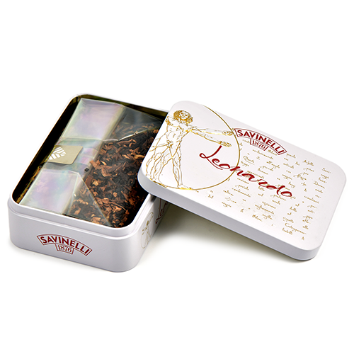 Табак "Savinelli - Leonardo".Два сорта черного и коричневого Кавендиша, три разных сорта Вирджинии были дополнены флейком Берли, измельченными вручную.В результате получается нежный, сладковато-глубокий и сливочный вкус с потрясающим ароматом кофе, шоколада и ванили.Крепость: 2,5 по 5-ти балльной шкале.Вкусовая группа: ароматик;Нарезка: Loose cut;Состав: Black Cavendish, Cavendish, Burley, Virginia;Ароматизация: кофе, шоколад, ваниль.Производитель: "Kopp Tobaccos GmbH & Co. KG", Реллинген, Германия.