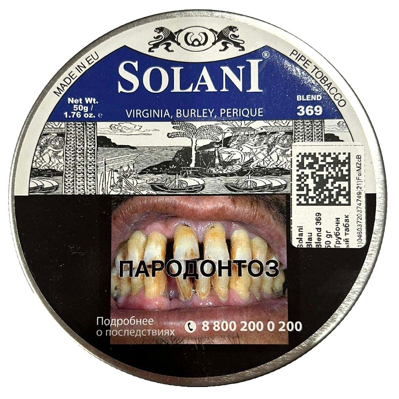 Отличный табак Solani Blue Label - blend 369  в сочетании Светлая и Красная Вирджинии, немного Бёрли и мягкий Чёрный Кавендиш, в сочетании с Периком создают эту приятную, мягкую ароматную смесь.
