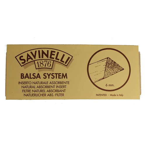 The Savinelli Balsa System представляет собой систему фильтрации с использованием природных атрибутов пробкового дерева. Это позволяет поглощать влагу и примеси из дыма, без добавления химических элементов. Эта способность поглощения обусловлена чрезвычайно пористыми волокнами бальсы, для идеального дыма без изменения вкуса и аромата табака.