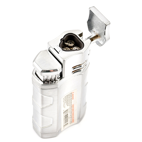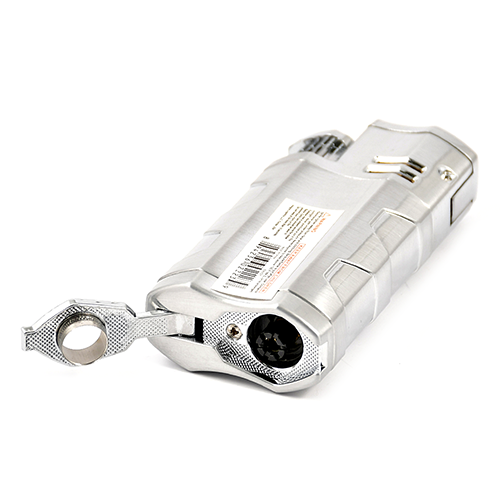 Прочная зажигалка с двойным турбопламенем, может использоваться как подставка для сигар, также встроен пробойник для сигар.