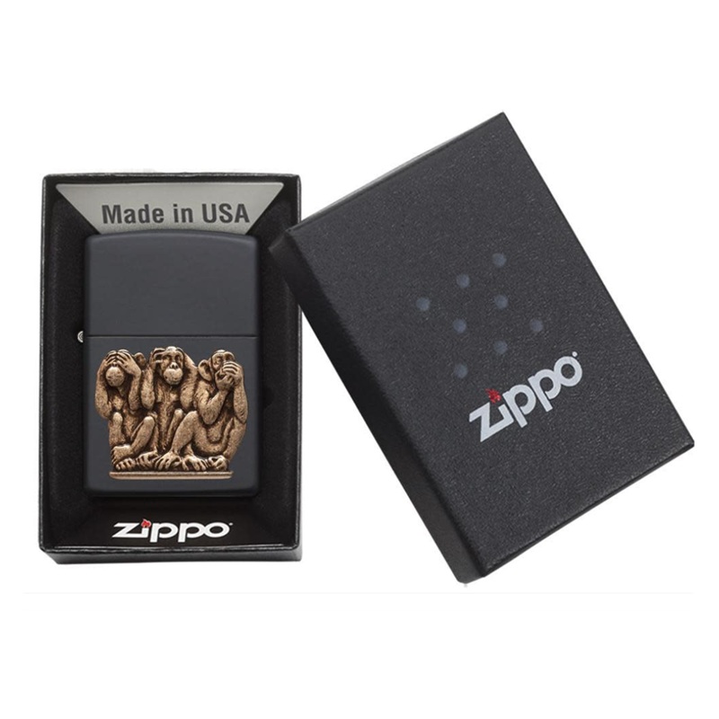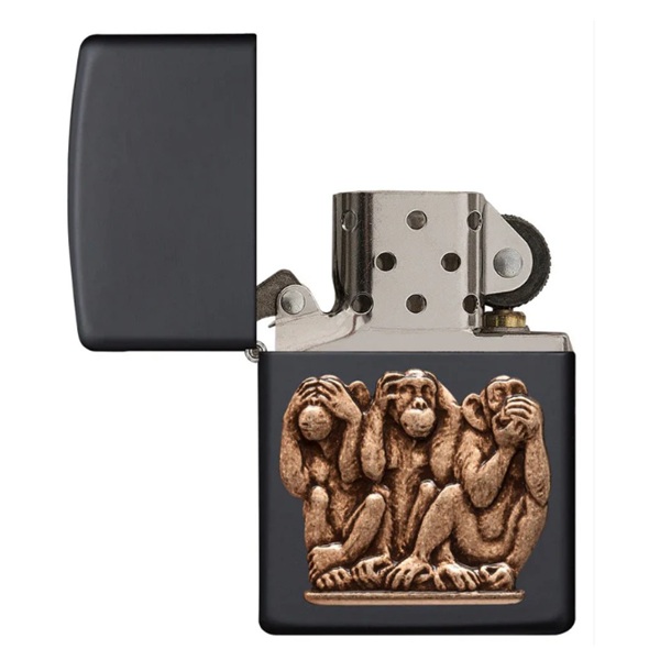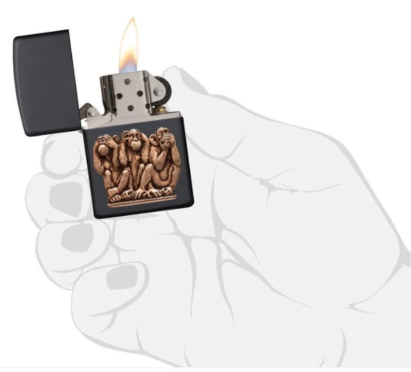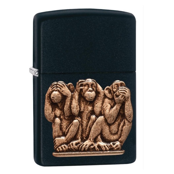 Не вижу зла. Не слышу зла. Не говорю зла. Новое исполнение векового предостережения от трехмерных приматов отлито из цельной латуни и помещено на классическую черную матовую зажигалку. Поставляется в подарочной коробке. Для оптимальной работы заправьте зажигалку топливом Zippo.